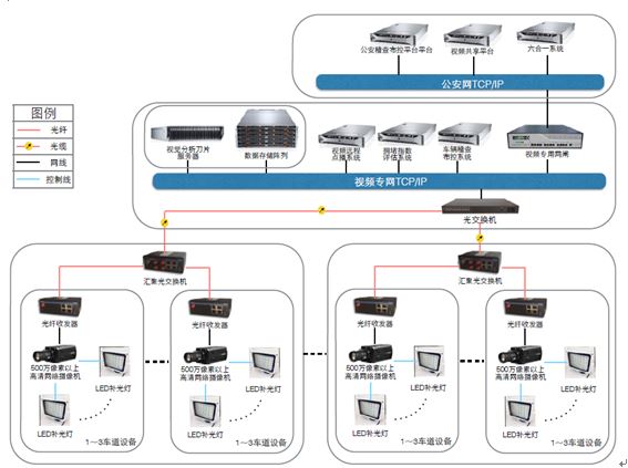 系統(tǒng)通過視頻采集設(shè)備對道路交通事件實時監(jiān)控并上傳至中心服務(wù)器,監(jiān)控中心的智能視頻處理軟件準確的分析出交通流量、占有率、排隊長度、車頭時距、速度等交通基礎(chǔ)數(shù)據(jù)及各種違法行為,通過各業(yè)務(wù)邏輯處理單元實現(xiàn)各類交通管理業(yè)務(wù)的處理并提供各類外部數(shù)據(jù)接口。交通仿真平臺對各路段緩行、擁堵、排隊長度等交通事件進行仿真分析,制定出對應的交通策略,適時調(diào)整控制交通信號燈的信號配時實現(xiàn)區(qū)域聯(lián)動,有效疏導緩解交通擁堵,也可為交通指揮中心提供輔助決策。