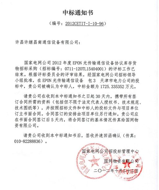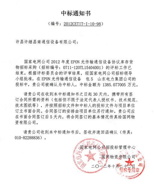 金秋十月,在這個收獲的季節(jié),國網公司傳來昌南公司中標的喜訊。通過許繼營銷平臺及各部門的共同努力,昌南公司在2012年度國網協(xié)議庫存EPON(無源光網絡)設備集招中,擊敗了中興、華為、烽火等國內眾多通信行業(yè)巨鱷公司,中標3110余萬元,占總中標金額的40.5%的好成績。無源光網絡設備計劃在今后5年內在電網領域共完成建設1300余萬點,目前僅完成30余萬點招標,昌南公司此次中標為今后5年的發(fā)展打下很好的基礎。