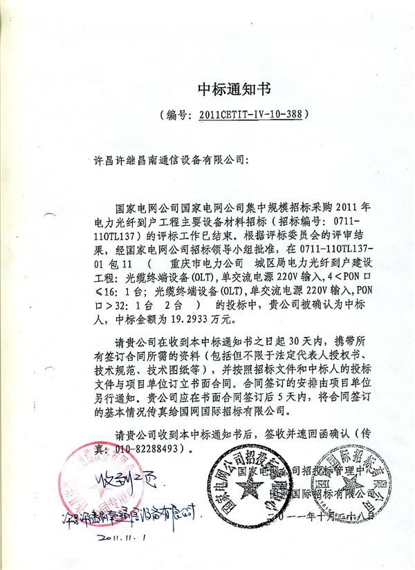 昌南公司中標2011年電力光纖到戶工程國家電網(wǎng)公司集中采購中重慶地區(qū)