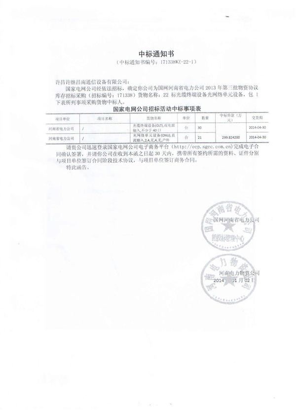 中標河南省電力公司2013年第三批物質(zhì)協(xié)議庫存招標采購
